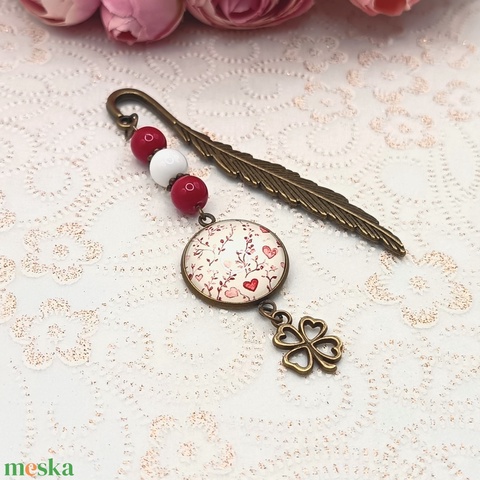 Antik bronz könyvjelző – piros szívecskés lencsével