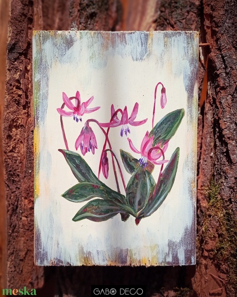 Bohém, botanikai, tavaszi, fára festett rusztikus kép, fatábla. Virág. Kakasmandikó
