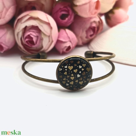 Antik bronz karkötő – fekete, arany szívecskés lencsével