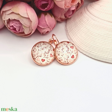Rózsaarany franciakapcsos fülbevaló – piros szívecskés lencsével