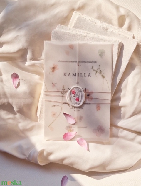 Merített papírra készült, akvarell virágos esküvői meghívó pausz papírban és viaszpecséttel
