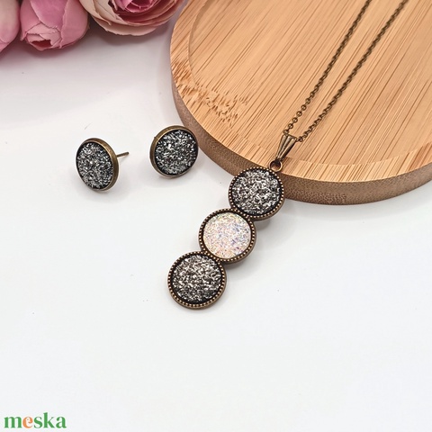 Antik bronz ékszerszett – csillogó grafitszürke / fényes fehér lencsével