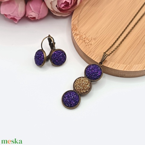 Antik bronz ékszerszett – csillogó lila / arany lencsével