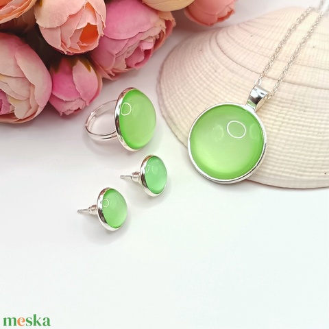 Ezüst ékszerszett – nyaklánc, gyűrű és bedugós fülbevaló halványzöld üveg lencsével