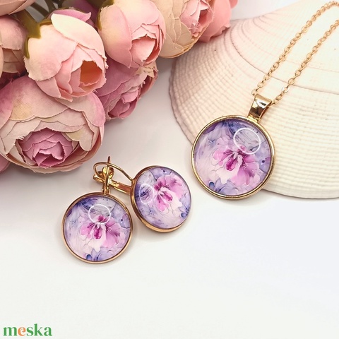 Arany ékszerszett – nyaklánc és fülbevaló rózsaszín/lila virágmintával