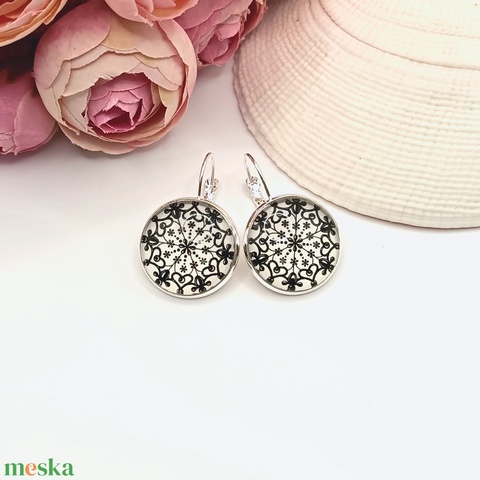 Ezüst franciakapcsos fülbevaló – fehér, fekete csipkemintás lencsével