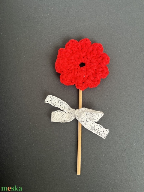 Egy 6 mm átmérőjű és 20 cm hosszú fa pálcára rögzített horgolt virág. A leveleket a csipke masni szimbolizálja. 🙂
