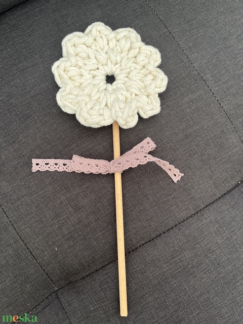 Egy 6 mm átmérőjű és 20 cm hosszú fa pálcára rögzített horgolt virág. A leveleket a csipke masni szimbolizálja. 🙂