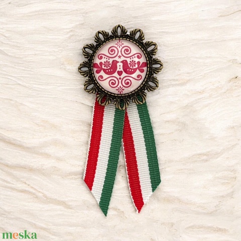 Üveglencsés kokárda március 15 népi motívummal bronz