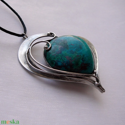 A medál Tiffany technikával készült krizokolla és ólommentes, ezüsttartalmú ón felhasználásával. A díszítés szintén saját készítésű, nem tartalmaz gyári elemeket. A fémrészt óezüstre patináztam és lelakkoztam, hogy sokáig szép maradjon.