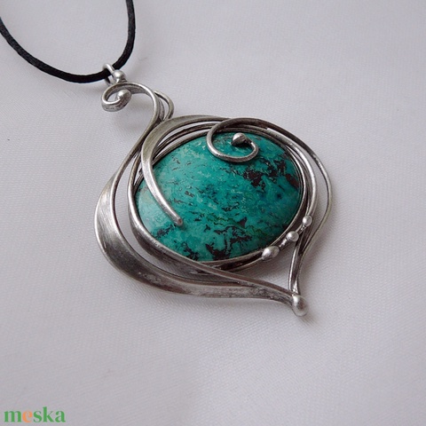 A medál Tiffany technikával készült krizokolla és ólommentes, ezüsttartalmú ón felhasználásával. A díszítés szintén saját készítésű, nem tartalmaz gyári elemeket. A fémrészt óezüstre patináztam és lelakkoztam, hogy sokáig szép maradjon.