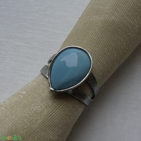 A gyűrű Tiffany technikával kézült kék opál és ólommentes, ezüsttartalmú ón felhasználásával. A díszítés szintén saját készítésű, nem tartalmaz gyári elemeket. A fémrészt óezüstre patináztam, lekezeltem antioxidánssal és lelakkoztam, hogy sokáig szép maradjon.