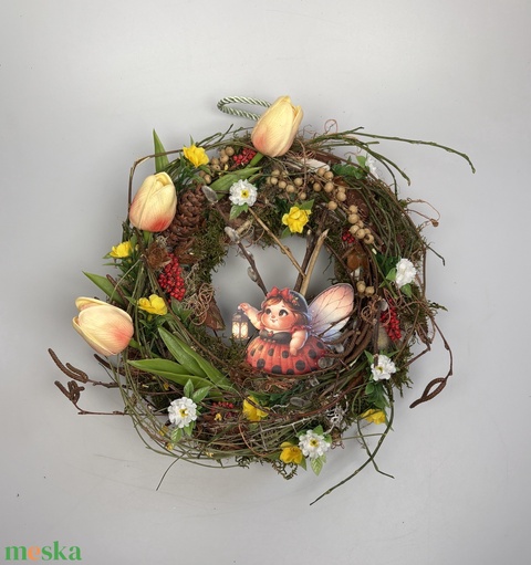 Katica világa - élénk színvilágú, tulipános síkalapos ajtódísz, lámpást tartó katicát ábrázoló fatáblával