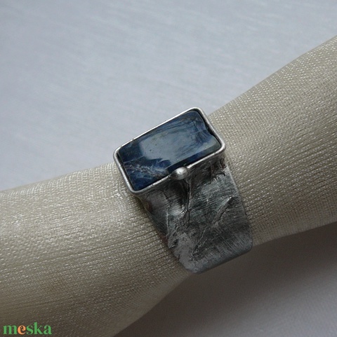 A gyűrű Tiffany technikával készült szodalit és ólommentes, ezüsttartalmú ón felhasználásával. A fémrészt óezüstre patináztam és lelakoztam, hogy sokáig szép maradjon.