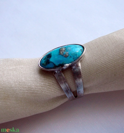A gyűrű Tiffany technikával készült rekonstruált türkiz és ólommentes, ezüsttartalmú ón felhasználásával. A díszítés szintén saját készítésű, nem tartalmaz gyári elemeket. A fémrészt óezüstre patináztam és lelakoztam, hogy sokáig szép maradjon.