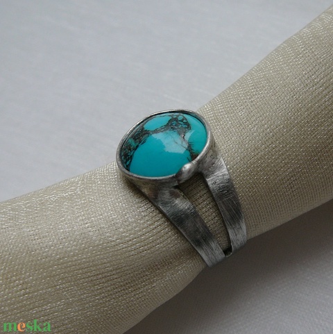 A gyűrű Tiffany technikával készült rekonstruált türkiz és ólommentes, ezüsttartalmú ón felhasználásával. A díszítés szintén saját készítésű, nem tartalmaz gyári elemeket. A fémrészt óezüstre patináztam és lelakoztam, hogy sokáig szép maradjon.