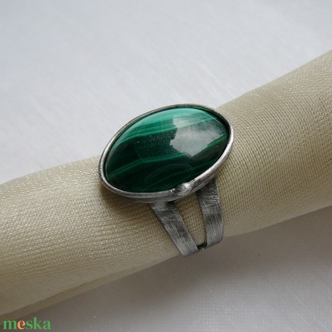 A gyűrű Tiffany technikával készült malachit és ólommentes, ezüsttartalmú ón felhasználásával. A díszítés szintén saját készítésű, nem tartalmaz gyári elemeket. A fémrészt óezüstre patináztam és lelakoztam, hogy sokáig szép maradjon.