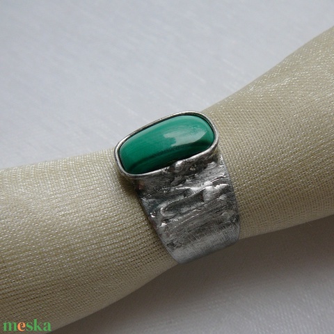 A gyűrű Tiffany technikával készült malachit és ólommentes, ezüsttartalmú ón felhasználásával. A díszítés szintén saját készítésű, nem tartalmaz gyári elemeket. A fémrészt óezüstre patináztam és lelakoztam, hogy sokáig szép maradjon.