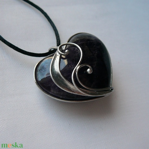 A medál Tiffany technikával készült ametiszt és ólommentes, ezüsttartalmú ón felhasználásával. A díszítés szintén saját készítésű, nem tartalmaz gyári elemeket. A fémrészt óezüstre patináztam, lekezeltem antioxidánssal és lelakkoztam, hogy sokáig szép maradjon.