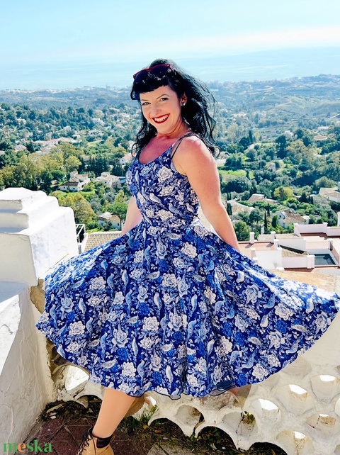 Pinup Rockabilly ruha, madaras virágos, porcelán mintás sötétkék tavasz