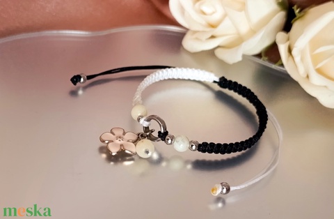 Fekete - fehér csomózott karkötő sárga berillel és virág medállal