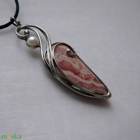 A medál Tiffany technikával készült rodokrozit és ólommentes, ezüsttartalmú ón felhasználásával. A díszítés szintén saját készítésű, nem tartalmaz gyári elemeket. A fémrészt óezüstre patináztam, lekezeltem antioxidánsal és lelakkoztam, hogy sokáig szép maradjon.