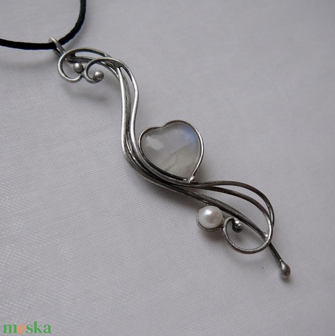 A medál Tiffany technikával készült holdkő és ólommentes, ezüsttartalmú ón felhasználásával. A díszítés szintén saját készítésű, nem tartalmaz gyári elemeket. A fémrészt óezüstre patináztam és lelakkoztam, hogy sokáig szép maradjon.