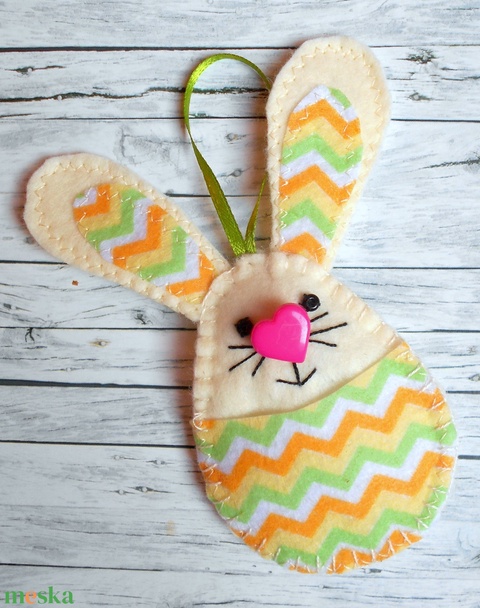 Zsebes nyuszi barkácsfilcből (narancs-almazöld-fehér cikk-cakk mintás)