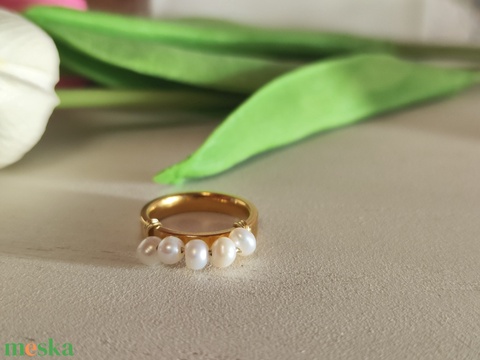 Arany színű nemesacél karika gyűrű édesvízi tenyésztett gyöngyökkel!