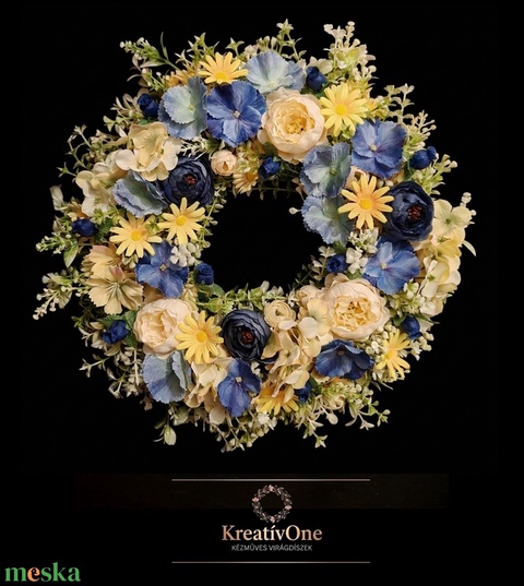 Tavaszi ajtódísz kék és sárga virágokkal