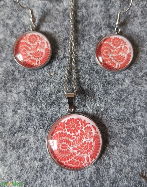 Üveg lencsés, orvosi acél nyaklánc és fülbevaló szett népi motívummal