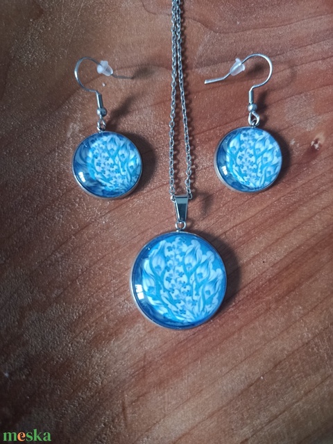 Üveg lencsés, orvosi acél nyaklánc és fülbevaló szett népi motívummal