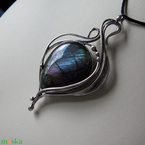 A medál Tiffany technikával készült labradorit és ólommentes, ezüsttartalmú ón felhasználásával. A díszítés szintén saját készítésű, nem tartalmaz gyári elemeket. A fémrészt óezüstre patináztam, lekezeltem antioxidánsal és lelakkoztam, hogy sokáig szép maradjon.