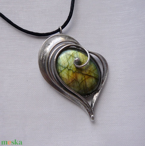 A medál Tiffany technikával készült labradorit és ólommentes, ezüsttartalmú ón felhasználásával. A díszítés szintén saját készítésű, nem tartalmaz gyári elemeket. A fémrészt óezüstre patináztam, lekezeltem antioxidánsal és lelakkoztam, hogy sokáig szép maradjon.
