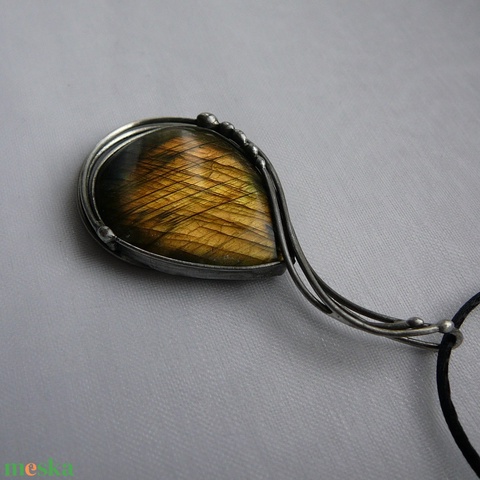 A medál Tiffany technikával készült labradorit és ólommentes, ezüsttartalmú ón felhasználásával. A díszítés szintén saját készítésű, nem tartalmaz gyári elemeket. A fémrészt óezüstre patináztam, lekezeltem antioxidánsal és lelakkoztam, hogy sokáig szép maradjon.