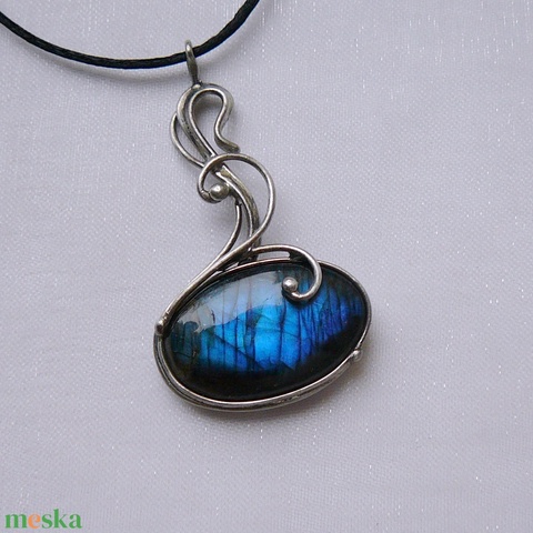 A medál Tiffany technikával készült labradorit és ólommentes, ezüsttartalmú ón felhasználásával. A díszítés szintén saját készítésű, nem tartalmaz gyári elemeket. A fémrészt óezüstre patináztam, lekezeltem antioxidánsal és lelakkoztam, hogy sokáig szép maradjon.