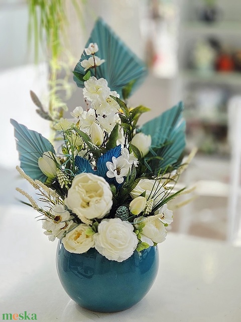 Óriás türkiz kaspós tulipános tavaszi asztaldísz