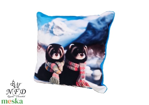 Gyönyörű egyedi dekorpárna havas vadászgörények sállal mintával!(csak huzat!)