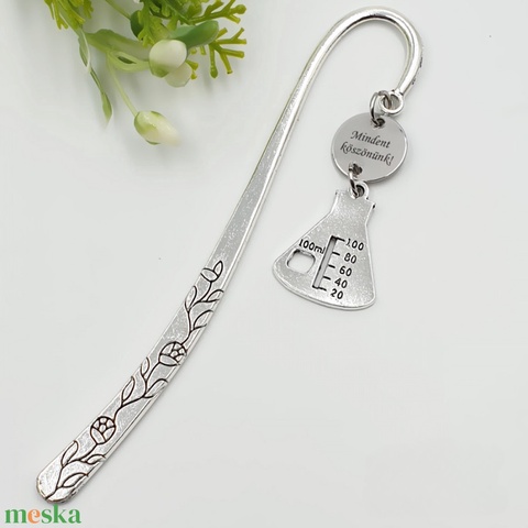Kémia tanároknak ajándék - Gravírozott könyvjelző egyedi felirattal, lombik charmmal