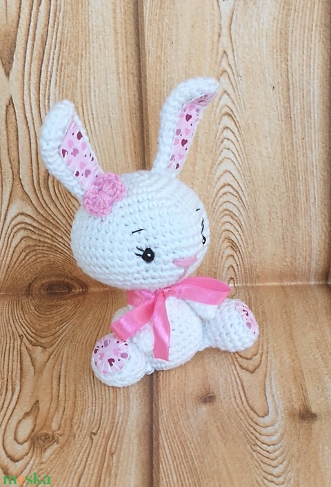 Fehér Nyuszi lány - szivecskés - pink szalagos - horgolt marokállat