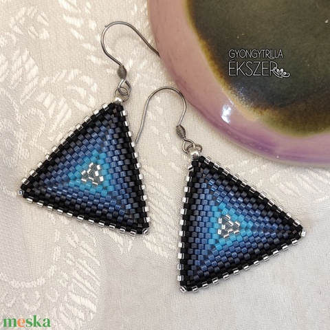 Ezüst-kék-szürke-fekete átmenetes gyöngyfűzött háromszög fülbevaló