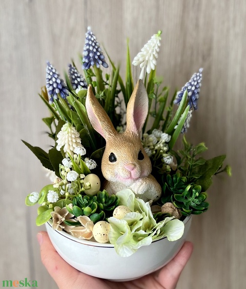Lila fehér Húsvéti asztaldísz tálban