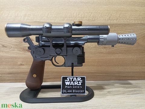 Han Solo DL-44-es lézerpisztolyának 3D nyomtatott replikája. Ez a pisztoly nem egy egyszerű játék, hanem egy aprólékos kézműves munkával, airbrush technikával megalkotott kiállítási darab, amely a filmek ikonikus fegyverének hangulatát idézi .