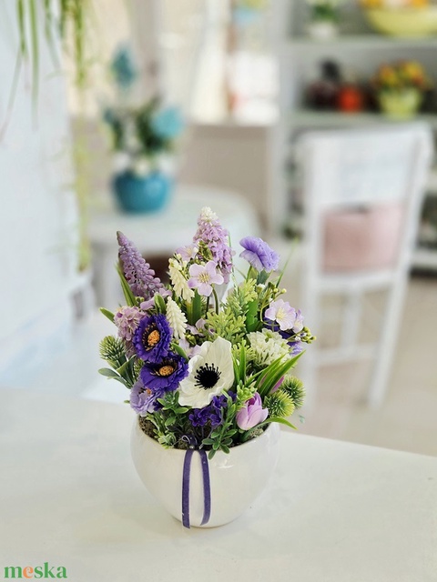 Fehér kaspós lila tavaszi asztaldísz