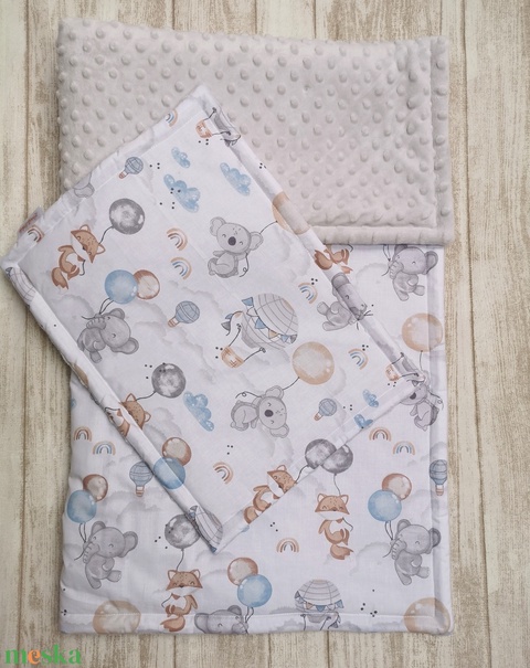 Bélelt baba takaró + párna szett "Elefánt, róka, koala lufival" Bézs miky-vel - UNISEX
