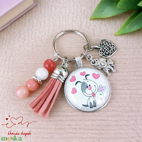 Cuki kutyás üveglencsés kulcstartó rózsaszín bojttal – ajándék gyerekeknek