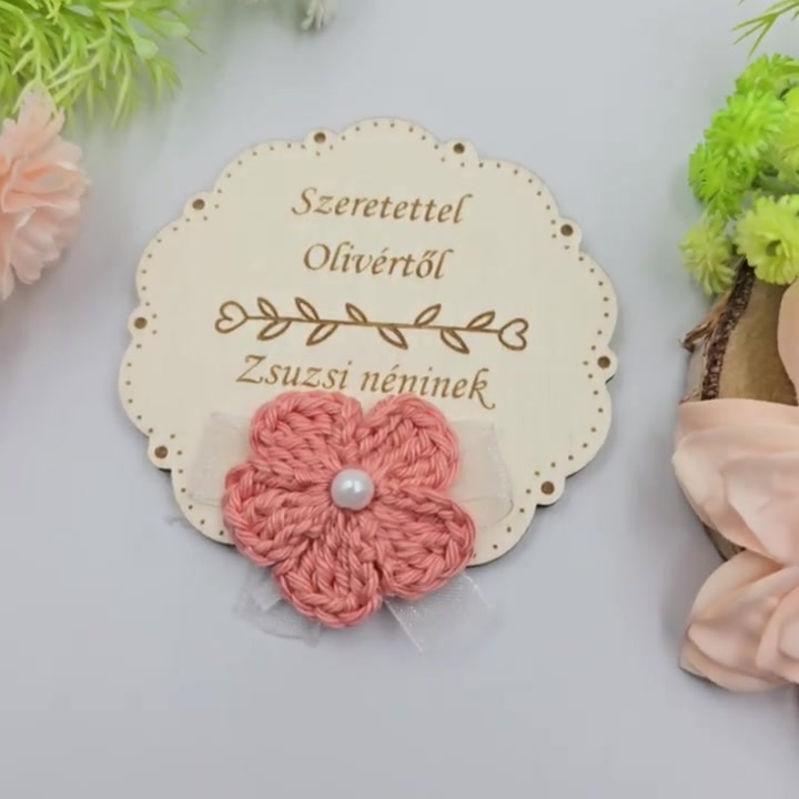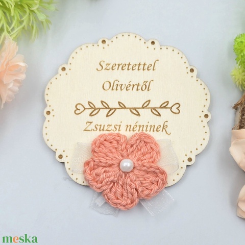 Tanító néninek, óvó néninek ajándék - Gravírozott fa hűtőmágnes egyedi felirattal, horgolt virágokkal
