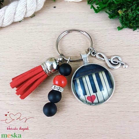 Zongorabillentyűs üveglencsés kulcstartó piros bojttal – ajándék zenetanárnak