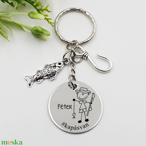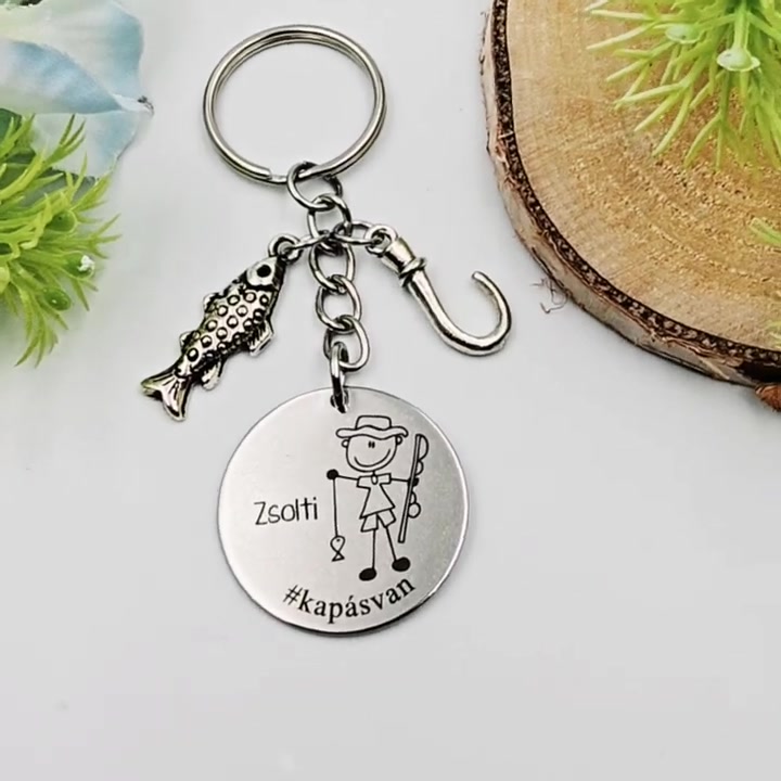 Horgásznak ajándék - horgász kulcstartó grafikával, egyedi névvel, felirattal