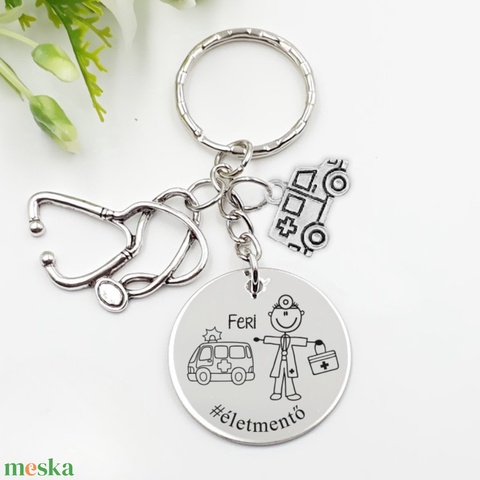 Mentősnek ajándék - mentős kulcstartó grafikával, egyedi névvel, felirattal